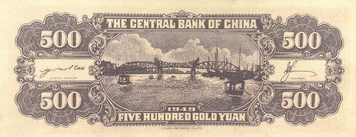 其五,为民国三十八年(1949)中央银行发行的伍百圆金圆券。此券纵60、横147毫米,由中华书局股份有限公司公司印制,其背面图景为广州海珠桥(图5)。海珠桥是广州市第一座跨江大桥,位于珠江副航道,北连海珠广场、南接江南大到北。1929年动工,1933年建成通车;桥长180、宽18.3米,为简支拱形下承钢桁架梁。1938年日军侵占广州,海珠桥遭破坏。1949年国民党军队败退时将桥炸毁,中孔钢梁沉没江中,南北两孔大梁折断,东南桥墩与西北桥墩皆被炸毁。1950年市政府开始重建海珠桥,外观与原桥大致相若。2013年,海珠桥又以全新面貌通车。