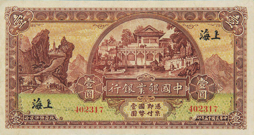其三,为民国二十年(1931)中国垦业银行发行的壹圆国币券。此券纵82、横155毫米,由英国华德路公司印制,正面图景为广州十三行潘长耀家园(图3)。广州十三行是清代专做对外贸易的牙行,是清政府指定专营对外贸易的垄断机构。又叫“洋行”或“洋货行”。而潘长耀为清中叶著名粤商,广州十三行中的丽泉行商人,为当时的世界首富之一,富可敌国。其热衷于奢侈生活,修建庭院。券上即印着他的豪华家园府邸的园林水榭。惜清咸丰年间,广州西关火灾,十三行付之一炬,潘长耀家园亦今多已不存。