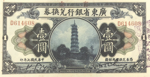 其二,为同年同行发行的壹圆银元兑换券。该券纵77、横146毫米,由美国钞票公司印制,正面图景为广州六榕寺花塔(图2)。花塔坐落在广州市越秀区的六榕寺内,其始建于梁大同三年(537),后毁于大火。北宋绍圣(1097)重建。1980年对花塔进行修葺时,在塔壁中发现印有北宋年号的砖铭。塔为砖木结构,平面八角形,外九层、内十七层,楼阁式,高57.6米。塔身为井筒式结构,底层直径12米并有副阶。塔内楼梯为穿壁绕平座式,各层塔身外设有回廊,各层层檐以绿色硫璃瓦覆顶,檐端微翘。现塔冠为元至正十八年(1358)所铸9.14米高的千佛铜柱,柱身刻有1023尊佛像及祥云天宫宝塔图,连同塔顶的火焰宝珠、三层九霄宝盘、九层宝轮、一层双龙宝盘、八根铁链,组成了重达5吨的塔刹。整塔朱栏碧瓦、丹柱粉壁,为历史文化名城广州的标志性建筑。