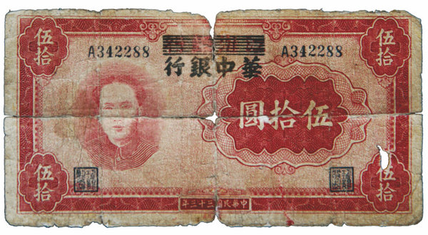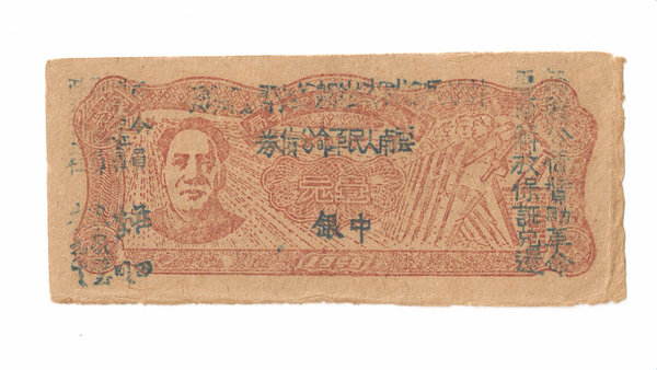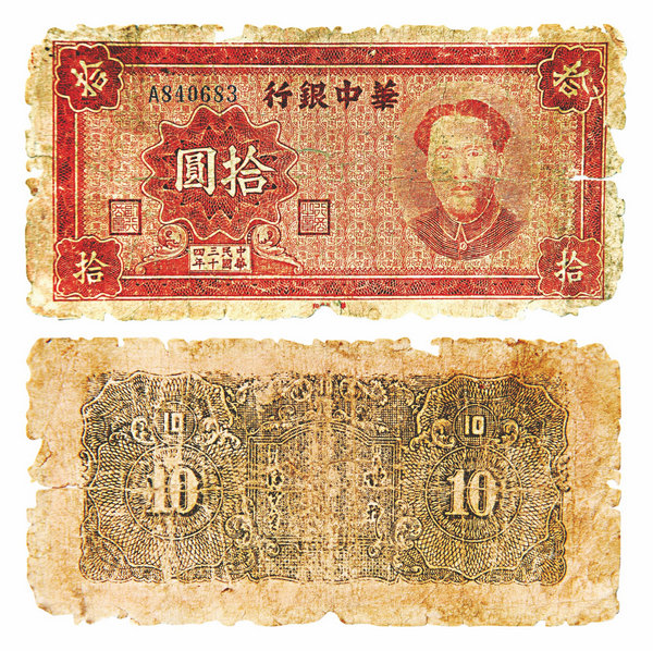 1945年8月1日,在江苏盱眙县张公铺乡成立了华中银行,行长陈穆,副行长徐雪寒。该行共发行了三枚毛泽东头像纸币。笔者收藏到其中两枚,一枚为拾元面值(图1),颜色为红色,票幅65×130毫米,毛泽东像位于纸币正面右侧;另一张面值伍拾元(图2),颜色红棕色,票幅67×129毫米。值得一提的是,该纸币是由江淮银行1944年印制好后,又由华中银行发行。纸币的上方“江淮银行”四个字,用条码改之,下面是重印“华中银行”四个字,毛泽东像位于纸币左侧。