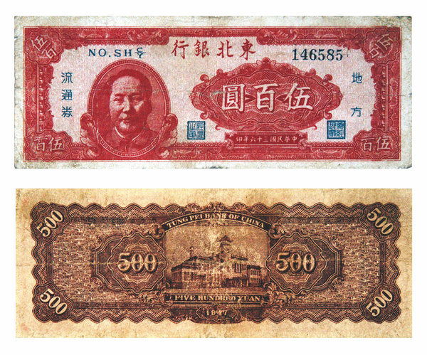 1945年11月12日,东北银行在沈阳大西关成立,总经理叶季壮(新中国首任外贸部部长),副经理王企之。该行发行有毛主席头像纸币三枚。这三枚纸币,面值都是伍佰元,票幅均为61×139毫米,颜色则有红色、蓝、黑色和灰黑三种。三枚纸币的毛泽东像,分别位于纸币正面的左、中、右位置。这三枚纸币笔者有幸收藏完备,其中毛泽东像靠左的这枚纸币(图3)品相较好。