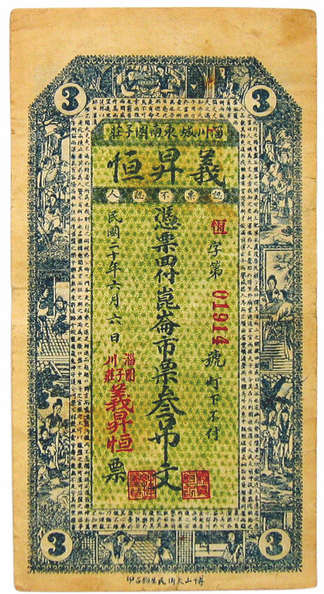图1所示为圈子村“义升恒”私票。此票用古代文学作品中的名篇、唐代大文学家韩愈的《送李愿归盘谷序》作周圈底纹,文字极小如粟米,不仅增强了防伪功能,而且增加了不少文化韵味。在外圈装饰了十幅人物画面。票面内容上面是“淄川城东南圈子村”“义升恒”字样,中间是“凭票回付昆仑市票叁吊文”。并有“灯下不付”“认票不认人”二行小字。民国二十年六月六日发行。