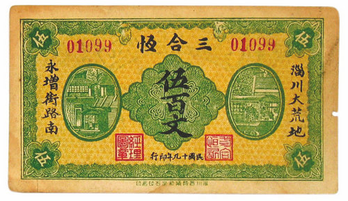 图3所示为洪山“三合恒”私票。票面以民宅建筑和花纹图案为装饰,面值五百文。左右印有“淄川大荒地”和“永增街路南”的商号详细地址,上面三个大字“三合恒”,民国十九年印行。背面上方为拼音字母,中间印有说明文:“此辅卷纯以流通市面找零之用,足十百兑换城关票壹吊。零百不兑”。
