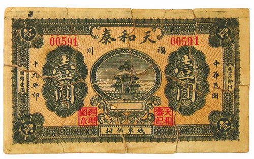图2所示为佛村“天和泰”私票。票面中间印有北京天坛图案,票值壹圆,并有淄川城东佛村“天和泰”字样,民国十九年发行。背面印有古代建筑图案,上方印有“通用国币”,下面印有“淄川佛村”。左右两行小字“灯下不付”,“改票作废”。