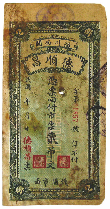 图4所示为淄川西关“德顺昌”私票。票面周围为花卉图案,中间纯色地,并有白文“德顺昌记”。面值贰吊文,上面印大字“淄川西关”“德顺昌”;中间是“凭票回付市票贰吊文”,并有小字“灯下不付”“钱随市面”字样;盖二枚齐缝印章:一枚圆形“淄川西关德顺昌”,一枚方形“德顺昌记”。背面全部以大写贰字为图案,盖圆章一枚。