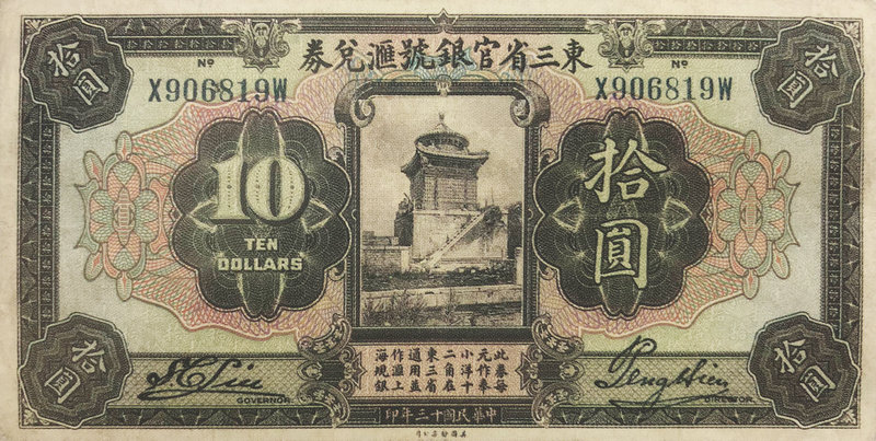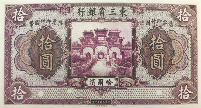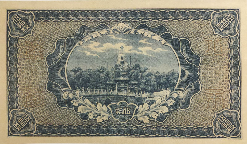 民国十年(1921),当时的东三省官银号发行之拾圆国币券上,其正面图景是北海公园内的小西天硫璃牌坊(图2)。小西天是乾隆皇帝为其母孝圣皇后祝寿祈福而修建的。大殿面积1260平方米,四面环水,有桥可通;殿四面各有琉璃牌坊一座,四角置方亭,整个建筑气势磅礴,雄伟壮观。它是中国最大的方亭式大殿,为北海公园内独特的景观。此币纵97、横173毫米,由美国钞票公司印制,十分精美。