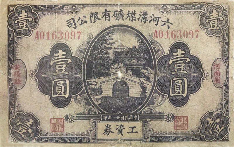 另外在民国二十一年(1932),当时的六河沟煤矿有限公司发行之壹圆工资券上,其正面也有北海公园静心斋的图景(图4)。静心斋位于北海公园内天王殿东北侧,占地面积4700平方米,是一座建筑别致、风格独特的“园中园”。该园建于乾隆二十二年(1757),初名镜清斋。光绪十一年(1885)重修,又称“乾隆小花园”,成为清代的行宫及皇太子的书斋。当年慈禧常乘小火车从中南海来此避暑,1913年改为今名。北海自1925年辟为公园以来,此处从未开放过。现经大力修整,已供游人参观。该处主要建筑有静心斋、韵琴斋、抱素书屋、枕峦亭、叠翠楼及沁泉廊等。位于西北侧的叠翠楼为园内的最高建筑,楼高两层,登楼远眺,北海景色尽收眼底。该园以山、池、桥、廊、亭、殿、阁的优美建筑布局取胜,是一座风光如画,妙趣无穷的小巧园林,为园林艺术中的杰作之一。而此币纵82、横129毫米,由当时的财政部印刷局印制,十分少见。