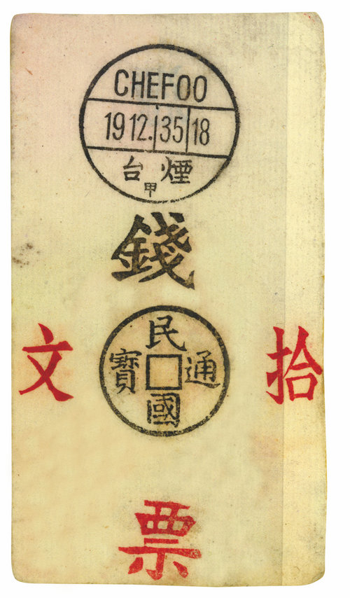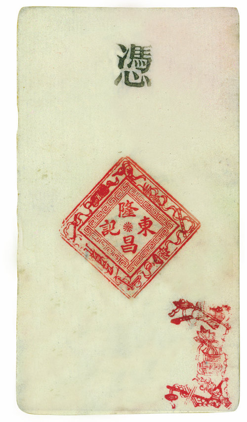 这张“拾文”钱庄票,正面上方印有黑色“凭”字,中间为红色正方形的钱庄名称“隆昌东记”,四周围绕用不同的防伪花纹图案装饰,右下侧采用红色的“灯笼”“荷花”“花篮”“笆扇”“梅花枝”等构成一幅喜庆兴旺的防伪图案,图案中隐藏“隆昌”二字暗记。反面上方盖有黑色“1912.35.18,烟台甲”双横线邮政日戳,戳下中印一个黑色“钱”字,中间是一枚黑色圆形方孔泉币“民国通宝”,中右侧盖红色“拾”字,中左侧盖红色“文”字,下方盖红色“票”字。从上到下,从右到左,读为“钱票拾文”。