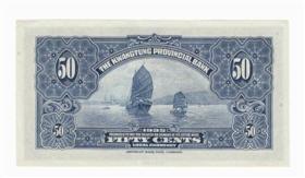笔者早年收藏有一张广东省银行于民国二十四年(1935)发行的面额伍毫银毫券。该券正面(图2)上方刊写行名“广东省银行”五字,下方为钞票号码,中央偏左有“银毫券”及纪值文字“伍毫”,两侧分别加盖有行长沈载和、副行长霍宝材签名,下方有“凭券兑换银毫”字样,再下方有印制日期“中华民国二十四年”,右侧椭圆框内以孙中山先生头像作为主景图案,四角各有纪值文字“伍毫”。背面(图3)中央印有“帆船扬帆竞发”图案,背面有英文文字,其内容基本与正面中文内容相同。该钞票是委托美国钞票印制的,图文设计精致,印刷也算精美。