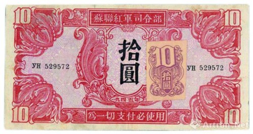 1945年8月8日,根据《雅尔塔协定》和《波茨坦公告》,苏联对日宣战,8月9日出兵我国东北。为解决苏联红军出兵东北对日作战的经费,按国民党政府和苏联政府签订的《中苏友好共同对日作战协定》规定,苏联红军司令部于1945年10月22日至1946年4月底发行了苏联红军司令部钞票,当时人们简称为苏军票,有1元、5元、10元、100元四种面额,发行总额97.25亿元。该钞票系在苏联国内印制,图案具俄罗斯传统风格,均带有水印,流通使用于我国东北地区。