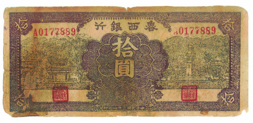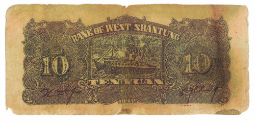 如图所示这张鲁西银行抗币,面值10元,票幅75×143毫米。主体图案为:寺塔,纸币的正上方是“鲁西银行”四字,中间为:拾圆,下方是中华民国三十一年印,四只角上都有“拾”字,编码为:A0177889。鲁西银行发行的抗币,见证了山东抗日战争期间军民鱼水情历史。