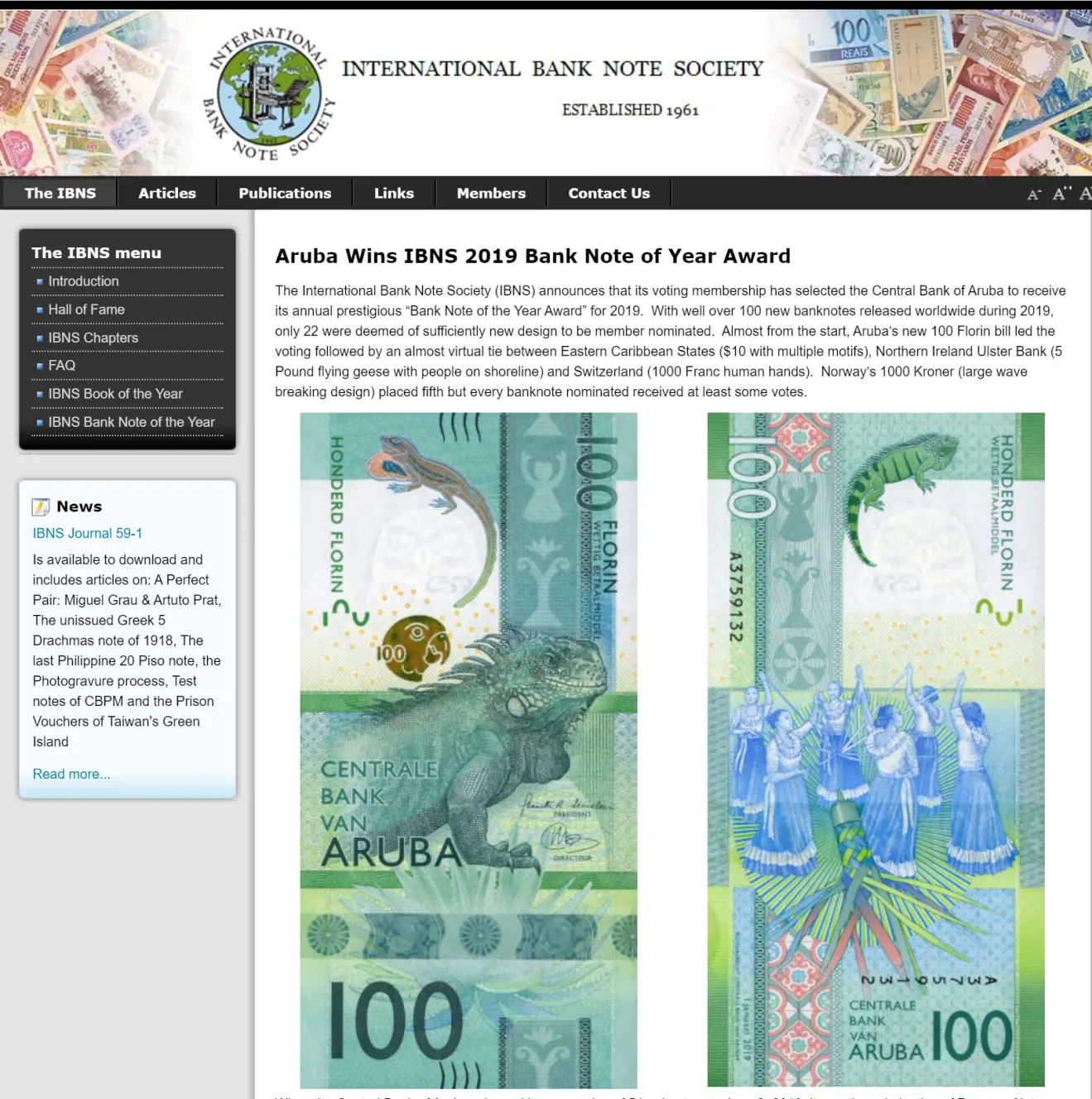 阿鲁巴100弗罗林(Florin)纸币荣获了世界钞票协会(IBNS)2019年世界最佳纸币大奖!
