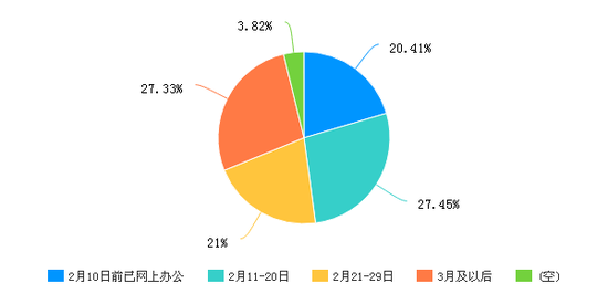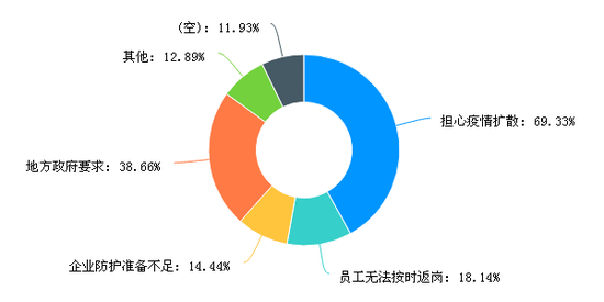 本次调研中,47.86%受访企业表示已经或将在20日前复工;21%计划在2月21-29日期间复工;其余表示计划在3月及以后复工。未复工的原因,主要是担心疫情扩散(69.33%)以及地方政府要求(38.66%);部分企业还存在因员工无法按时返岗(18.14%)和企业防护准备不足(14.44%)而不能复工的情况。