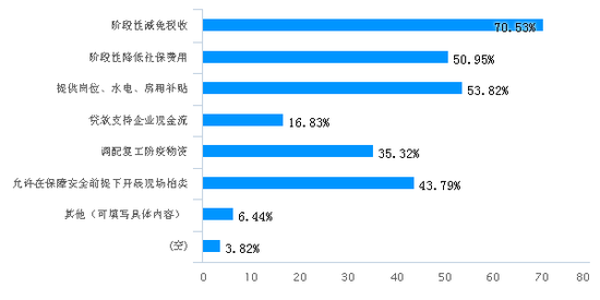 调研显示,针对疫情带来的困难,企业最迫切希望获得的政策支持是阶段性减免税收(70.53%)、提供岗位、水电、房租补贴(53.82%)、阶段性降低社保费用(50.95%),以及允许在保障安全前提下开展现场拍卖(43.79%)。