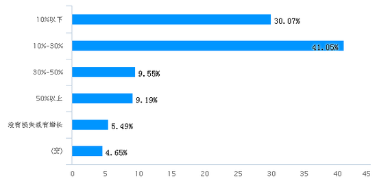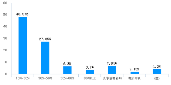 受疫情影响,有41.05%的企业预估推迟复工的损失情况(占去年1季度营业收入的比重)在10-30%之间;9.55%预估损失在30-50%之间;9.19%认为损失在50%以上。三项合计达到59.79%。
