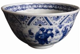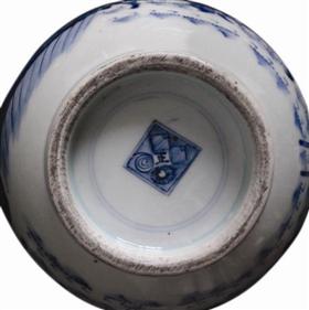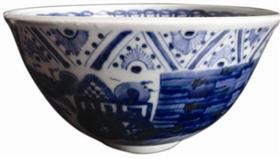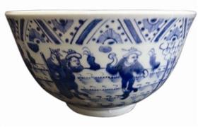 而笔者今天讲的是,与“珍稀古本”年代相同的一块瓷片,它也叫“八蛮进宝”(图1)。这块瓷片成人巴掌大小,瓷白画青,所绘人物穿戴、身佩俱有异域特色,人物身姿形态与周围“云山石草”形成一幅较为完整的、生动有趣的瓷上画面,十分讨喜!这是南京藏家叶先生为研究而收藏使用的标本。像这样的青花大碗,我过去还拍过一些(图2、3),它们都是碗心有一条盘龙的器物,且画意细腻,发色也非常好!是较为典型的这个时期的青花图案和“正”字款识。它们均被藏家视为吉祥之物!