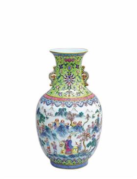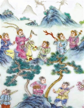 “八蛮进宝”是较为著名的图式,在清代的许多瓷器上,或青花、或粉彩,均有绘式呈现,被人称为“皇朝遗珍”。例如清道光时期的“粉彩八蛮进宝图”双耳瓶(图4),所显示的就是一幅“八蛮进宝”的盛况。据有关史料记载,“八蛮进宝”的题材自唐代起就广为流行,常用来比喻“国力强盛,万国来朝。”这种绘事至明清而不衰。《周礼·尔雅》中记载,“八蛮”是指我国古代南方“天竺、咳首、焦侥……”八个少数名族之国名。我们知道,中国封建帝国在唐朝时发展到最高峰,与西域及南海诸国交流频繁,同时因为帝国之强大富庶与辽阔疆域,历代帝王都以“天子”自居,意思是“天之骄子”,他们傲慢地认为外国“皆处于蛮荒之地”,所以在外交上,大凡是外国使臣来访或外国商人求见,都要置于“朝见天庭、称臣纳贡”这个大前提、大原则之下,加以跪拜,不能以平等地位外交,所以有了“八方绥用,万方来朝”这样自鸣得意之语。这种现实心态反映在艺术创作上,就有了“万国来朝”“胡人献贡”“八蛮进宝”等题材。