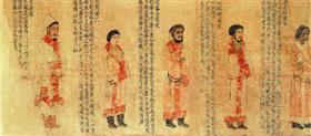 萧绎算是见过“大世面”的艺术家,他的《职贡图》原作朝贡人物不少于25国,甚至超出31国。现仅存12国画像。《职贡图》自右至左为:滑国、波斯、百济、龟兹、倭国、狼牙修、邓至、周古柯、呵跋檀、胡密丹、白题及末国使者,每一位使者身后,有一简短的题记,叙述其国名、方位、山川道里、风土人情、与梁的关系,以及历来的朝贡情况。其榜题,滑国前行残,末国后段残,倭国只存前半,后半属宕昌国,其使者图像已逸,其余多有漫漶,内容与《梁书·诸夷传》相符,或更翔实。此图是中国绘画史上第一部用外域职贡人物为作画题材的工笔人物卷轴画,亦是现存最早的职贡图,同时也为后世研究绘画和历史提供了珍贵的史证材料,已不限于瓷画范畴。