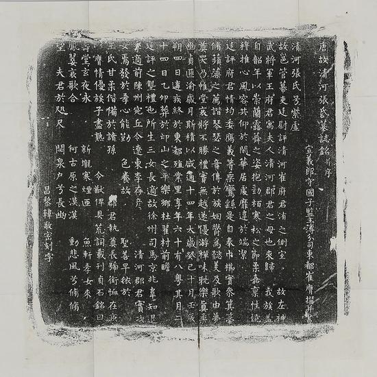 提要:此拓封面罗振玉墨笔题签:“唐清河张氏墓志,咸通十四年(873)十月廿四日。”石藏千唐志斋。此志全称:“唐故清河张氏墓志铭并序”,崔膺撰并书,昌黎韩敬密刻字。楷书,22行,行22字。清河张氏,号紫虚,为管幕吏廷尉评清河崔洧之侧室,两人琴瑟和谐,生有三女。