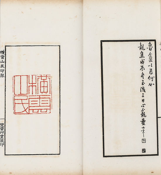 提要:是谱为张鲁庵望云草堂辑藏胡公寿印谱,内收梁清、张定、闵澐等名家为胡公寿所治印蜕35枚,每叶钤印一枚,后附边款于墨色边栏内,书口上镌“横云山民印聚”字样,下署“望云草堂藏印”。首镌王福庵署签,童大年序言。原签原函,朱泥璀璨,拓印俱佳。