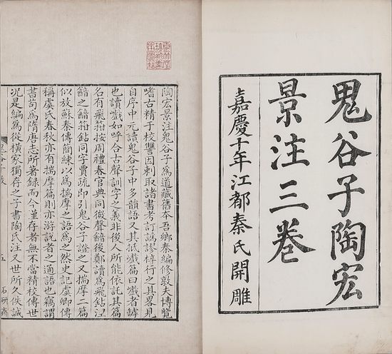 提要:《鬼谷子》为纵横家言,自隋、唐志始著录,凡三卷,诸本卷帙大抵相同,然校勘各有千秋。嘉庆十年,秦氏因感《道藏》本之讹误,以钱谦益绛云楼钞宋本为底本重付剞劂,又取唐、宋书注所引旧注,附于本文之下,倩甘泉吴涟仿宋体誊写,作《鬼谷子陶宏景注三卷》。