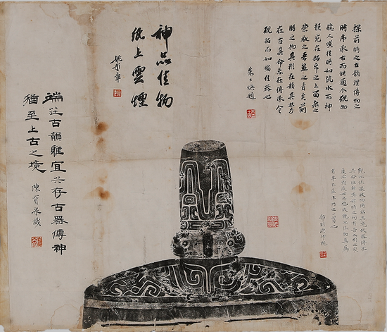 提要:是拓为阮氏家庙藏青铜钟全形拓,上有朱士焕、姚彤章、陈宝泉、郭则沄等四家墨笔题识。朱士焕墨笔题曰:“探前时之古韵,理博物之时序,承古而能通今……今观拓如睹佳器也,朱士焕题”。姚彤章跋曰:“神品佳物,纸上云烟”。陈宝泉隶书墨笔题识:“端庄古韵,雅宜共存,古器传神犹至上古之境,陈宝泉识”。郭则沄墨笔跋曰:“观此佳器故物,犹临其境,故器传承其命维新,叹前时之物有吾大国之气度,亦对后世之勉,故观此佳物真属有幸,不虚津门之一宝也,郭则沄拜观”。