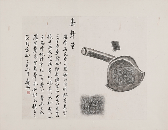 提要:秦朝统一度量衡,刻始皇二十六年(前221)诏书于量器上。诏书共四十字,文曰:“廿六年,皇帝尽并兼天下诸侯…乃诏丞相状、绾,法度量则不一歉疑者,皆明一之。”后多有拓本传世。是幅内收秦犛量全形拓及铭文,左侧邹寿祺墨笔题记,言海丰吴氏有一器与此同形,柄有“秦宰”二字,并考辨“犛”、“釐”之字意,落笔舒展,文雅可观。