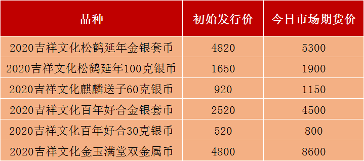 根据市场一线行情,2020年吉祥文化大全套期货价已经飙到了22250元,其中双金属币的期货价在8600元,相较初始发行价,已经涨了快一倍!