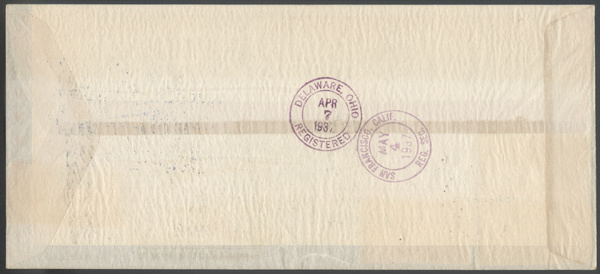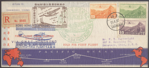 由相关邮戳可见,此枚首航封于1937年4月26日在上海挂号交寄,由中国航空公司的飞机于27日由上海携往香港,在九龙湾海面通过香港邮政移交“中国飞剪号”;再由“中国飞剪号”于4月29日携往美国,于5月4日抵达旧金山;然后由美国航空携往纽约,于5月7日抵达目的地特拉华州。