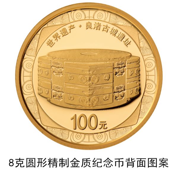 8克圆形金质纪念币背面图案为良渚古城遗址出土器物玉琮及其纹饰等组合设计。