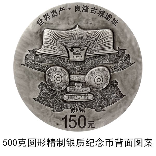 500克圆形银质纪念币背面图案为良渚文化神人兽面纹造型。