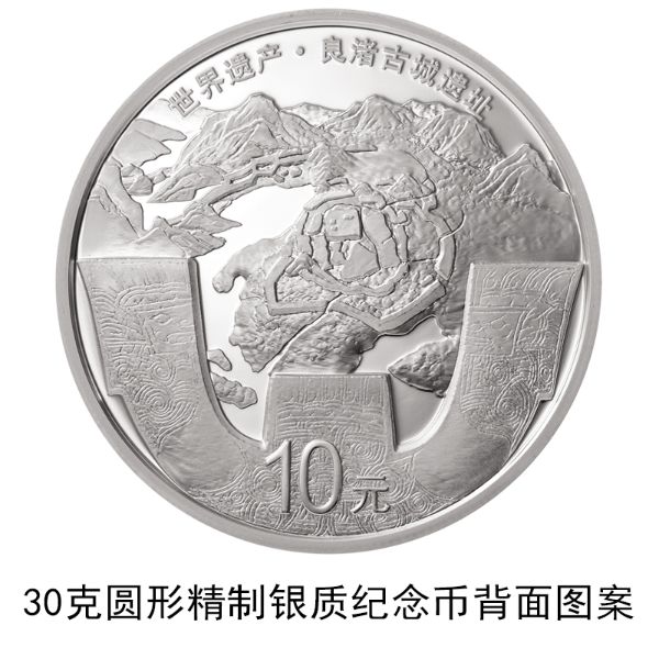 30克圆形银质纪念币背面图案为良渚古城及外围水利系统遗址、出土玉三叉形器等组合设计。