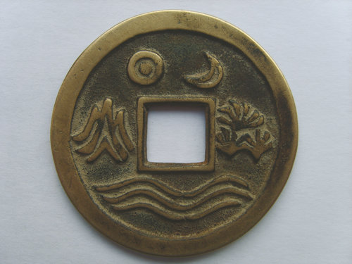 “孔方兄”(方孔圆钱),自有形制以来,就有天方地圆之说。此钱面文“九如三多”及钱背图饰日月星、三条水波纹、三座山峰、三朵佛手花均离穿离廓,相容于天地之间,容天地之气度,宁静、和美,博大、高远。