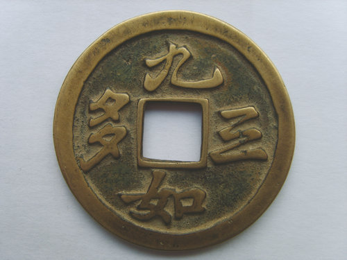 此钱形体较大,材质为精质黄铜,图文为手工雕制,似为清代传世的一种少见的宫钱。我国古钱中,宫钱是为皇家礼俗需要而铸,既有形制小的,更有钱体较大较厚的,大都图文独特,铜质精良,工艺考究,专为宫廷所用。有的后宫用,有的作为包袱扎角用,有的是皇帝赏赐用、喜庆用,有的是历代帝王供佛教寺院供奉用的;还有的把质量最好的万中选一,称“万选钱”供奉朝廷。所有种类宫钱,质高量少,都比较珍贵。此枚“九如三多”大花钱,缘宽内薄,直径51、穿径16、厚3毫米,现重33.2克,字廓深峻,图文佳构,充满神韵,雕工极美。足见此钱设计者深厚的文化底蕴,书体字为大书家所作,是铜铸的、固化的墨宝。
