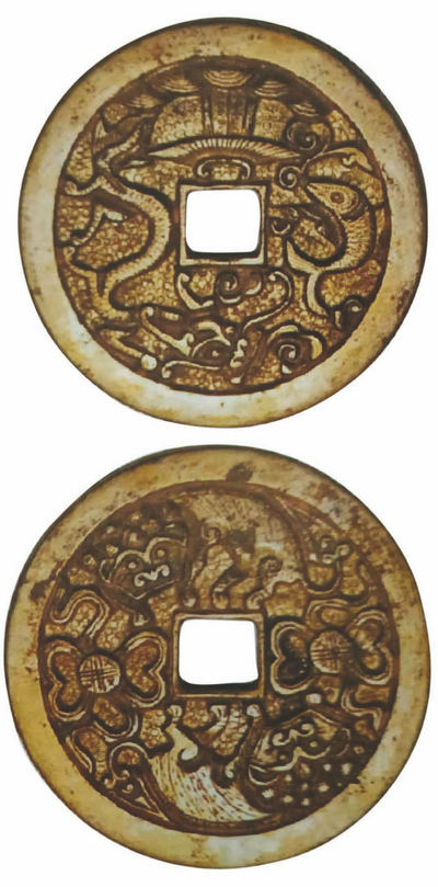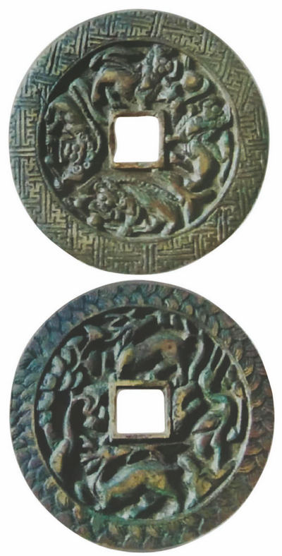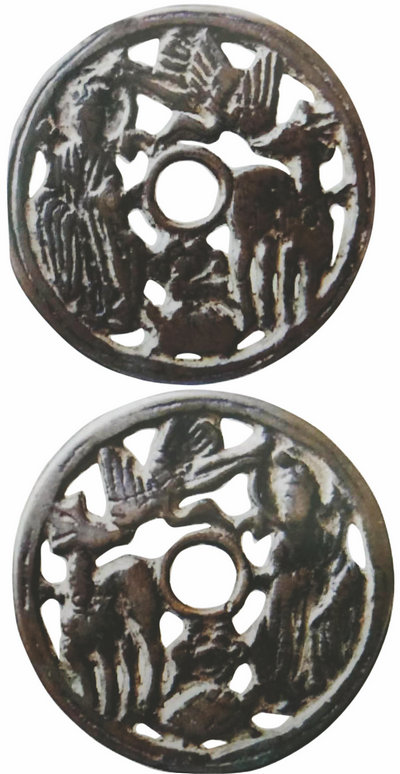 图1是一枚宋元时期福禄寿喜图案镂空花钱,直径51.3、厚2.8毫米。唐宋时期,镂空花钱大量出现。此花钱铸造精美,寓意丰富。其中,“福神”神采奕奕,立于花钱右侧;梅花鹿体态优雅,立于花钱之左;喜鹊飞姿矫健,立于花钱上方;乌龟神态形象,立于花钱下方。此花钱中福神谐音“福”;梅花鹿谐音“禄”;喜鹊谐音“喜”;乌龟喻指“寿”,整个花钱寓意“福禄寿喜”。