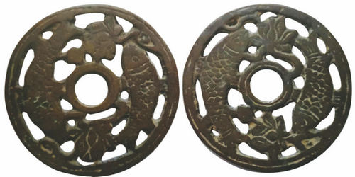 图2是一枚清代莲莲有鱼镂空花钱,直径63.21、厚2.1毫米。此花钱图案精美,双鱼栩栩如生,莲花亭亭玉立,双鱼谐音“有余”,莲花谐音“连连”。图案的寓意为“连连有余”。