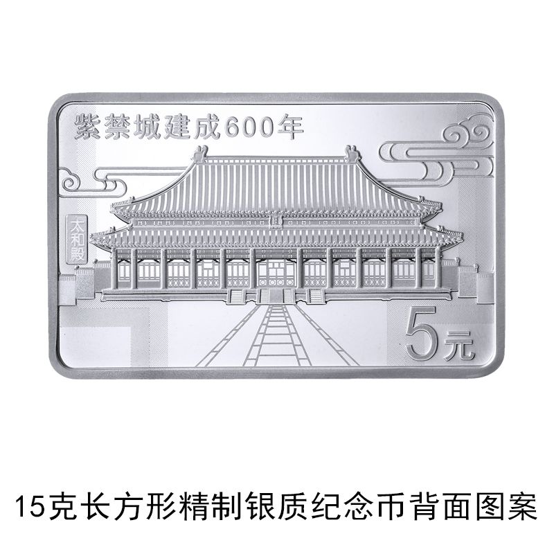 15克长方形银质纪念币背面图案为太和殿建筑造型,辅以祥云及台基等组合设计。