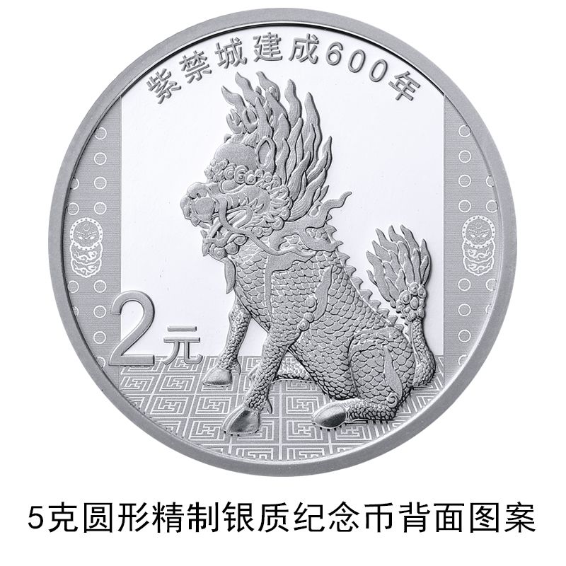 5克圆形银质纪念币背面图案为麒麟造型,辅以宫门、装饰纹样等组合设计。