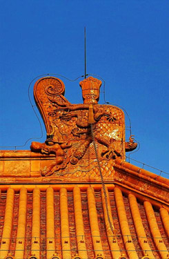大吻,亦称鸱吻、龙吻、鸱尾或螭吻,是安放在正脊两端封护屋面前后坡交汇部位的防水构件,也是房屋殿宇的装饰构件。汉代以前的重要建筑常在正脊的两端用凤凰装饰。汉武帝时宫殿曾被雷火焚毁,复建时采纳术士的建议,把屋顶正脊两端枢纽部位装饰为鸱形,用以消除火灾,并在鸱吻背部插一把扇形剑,以防其逃跑。史书载汉代的柏梁殿上已有“鱼虬尾似鸱”一类的东西。晋代之后的记载中,出现“鸱尾”一词。中唐之后,“尾”字变成“吻”字,故又称为鸱吻。