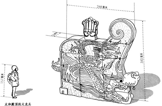 吻件按小分为“二样”至“九样”不等。“六样”以上大吻体积较大,由 5 块、7 块、9 块,11 块拼合而成,最多可至 13 块,称“十三拼”。太和殿的大吻是目前我国现存最大的大吻,也是紫禁城内最巨大的琉璃构件,高 3.4 米,宽2.68 米,厚 0.32 米,重 4.3 吨,由 13 件分拼成。清康熙三十四(1695)年, 太和殿灾后重建,大龙头开始在殿顶当值。直至 2007 年故宫博物院大规模重修,13 件才首次落到地上,312 年来第一次落地。