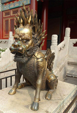 慈宁门前有一对鎏金铜麒麟,龙头、鹿角、龙身、马蹄、龙鳞,尾毛似龙尾状舒展。麒麟长 1.37 米,高 1.41 米,麟发上耸,两目前视,昂首挺胸,神形俱现。
