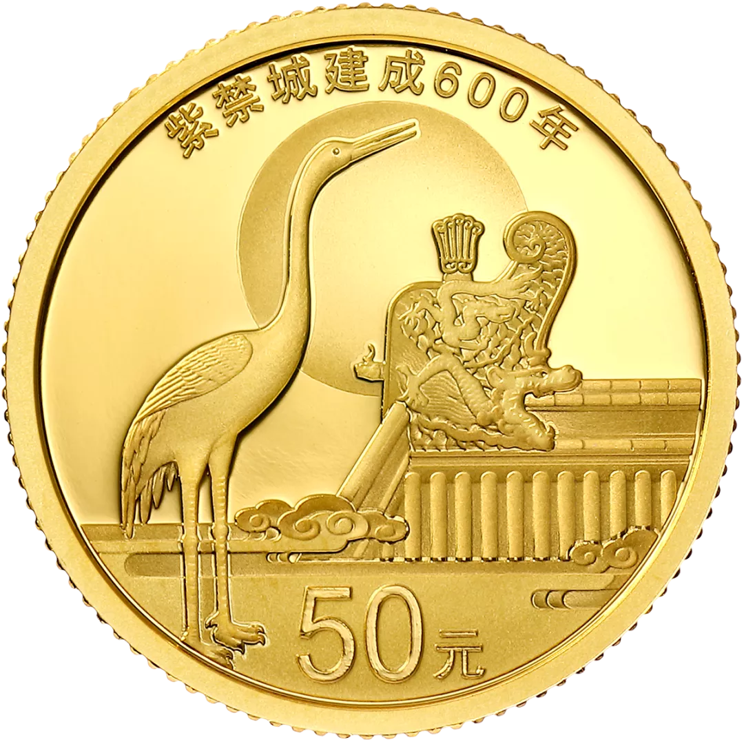 3克圆形金质纪念币,面额50元,直径18毫米,最大发行量6万枚,背面图案采用铜鹤和大吻形象。铜鹤图案取材于太和殿前广场上伫立的铜鹤。在中国文化中,鹤代表着仙风道骨的精神品格,与神格化的龟身兽一起,则寓意“龟鹤千秋,万寿无疆”。铜鹤背后的大吻,是紫禁城建筑中的重要部件,起到防水、装饰等多重作用,太和殿的大吻更是目前我国现存最大的大吻。把铜鹤与大吻作为金币上的图案,代表了中国人高洁的品格与中国建筑文化的传承。