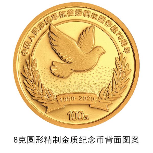 8克圆形金质纪念币背面图案为和平鸽、橄榄枝、杜鹃花等组合设计,并刊“中国人民志愿军抗美援朝出国作战70周年”、“1950-2020”字样及面额。