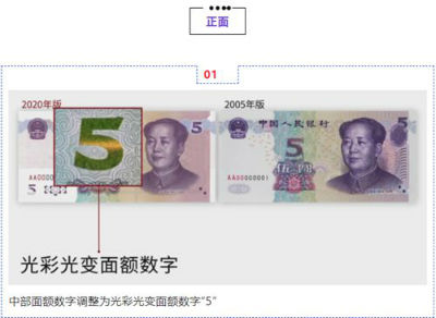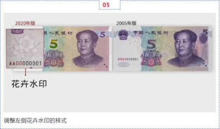 新版5元纸币正面中部面额数字调整为光彩光变面额数字“5”,左下角和右上角局部图案调整为凹印对印面额数字与凹印对印图案。左侧增加装饰纹样,调整面额数字白水印的位置,调整左侧花卉水印、左侧横号码、中部装饰团花、右侧毛泽东头像的样式。取消中部全息磁性开窗安全线和右侧凹印手感线。