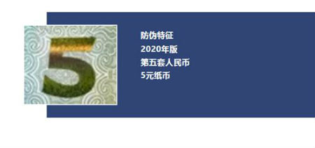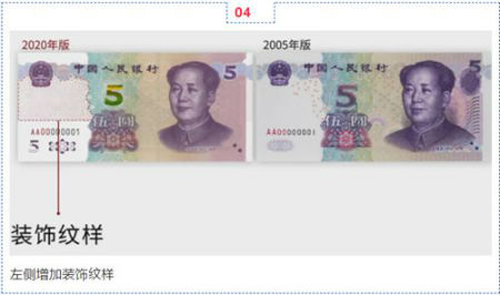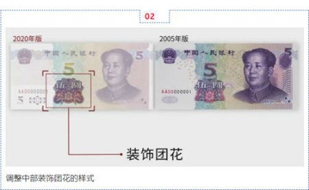 新版5元纸币背面左上角和右下角局部图案调整为凹印对印面额数字与凹印对印图案,调整主景、面额数字的样式,票面年号改为“2020年”。