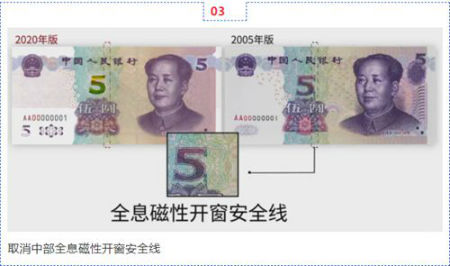 中国人民银行宣布,定于2020年11月5日起发行2020年版第五套人民币5元纸币,其主图案、主色调等要素保持不变,优化了票面结构层次与效果,提升了整体防伪性能。至此,第五套人民币本次提升工作已告完成。