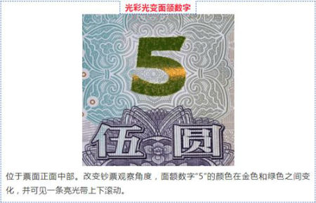 此外,正面中部面额数字调整为光彩光变面额数字“5”,和此前已发行的100元、50元等面额新版纸币一同加入“土豪金”的队列。而更重要的是提升了整体防伪性能。