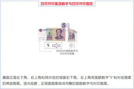 对于防伪特征,位于票面正面中部的光彩光变面额数字,改变钞票观察角度,面额数字“5”的颜色在金色和绿色之间变化,并可见一条亮光带上下滚动。票面正面左下角、右上角和其对应的背面右下角、左上角有面额数字“5”和对应图案的局部图案。透光观察,正背面图案组成完整的面额数字与对印图案。