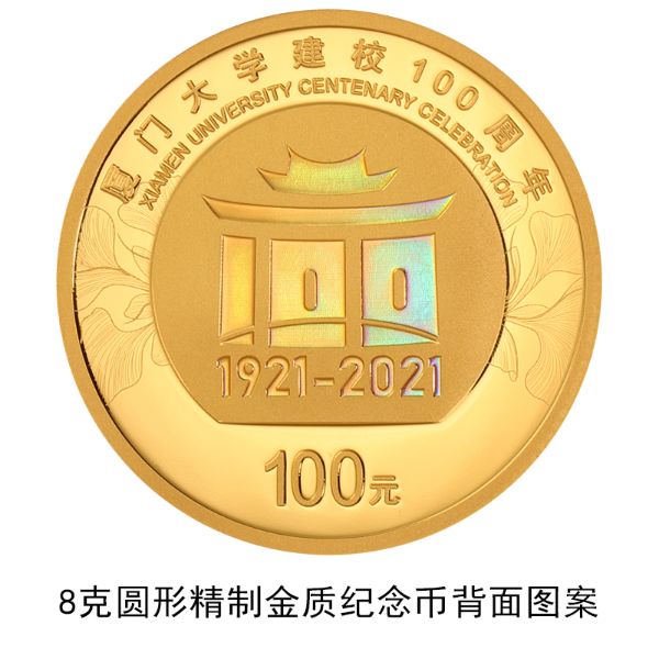 8克圆形金质纪念币背面图案为厦门大学100周年校庆标志主要图形,衬以凤凰花纹样等组合设计,并刊“厦门大学建校100周年”中文字样、“XIAMEN UNIVERSITY CENTENARY CELEBRATION”英文字样及面额。