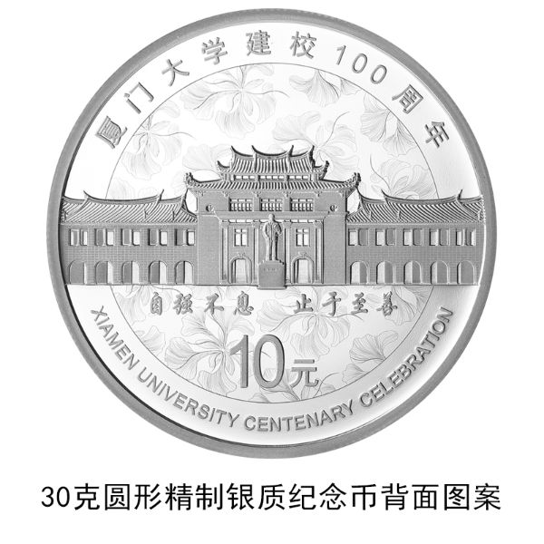 30克圆形银质纪念币背面图案为厦门大学群贤楼群造型、陈嘉庚雕像及校训,衬以凤凰花纹样等组合设计,并刊“厦门大学建校100周年”中文字样、“XIAMEN UNIVERSITY CENTENARY CELEBRATION”英文字样及面额。